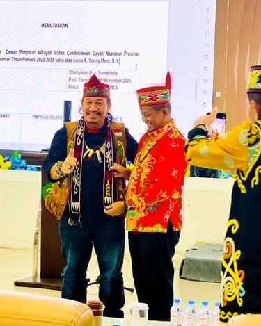 Pelantikan Pengurus Dewan Pimpinan Wilayah Ikatan Cendekiawan Dayak Nasional (DPW ICDN) Kalimantan Timur Periode 2025–2030 digelar pada Jumat, 28 November 2025, bertempat di Ruang Olah Bebaya, Rumah Jabatan Gubernur Kalimantan Timur, Samarinda. A. Vendy Meru, S.H. terpilih sebagai Ketua DPW ICDN Kalimantan Timur.